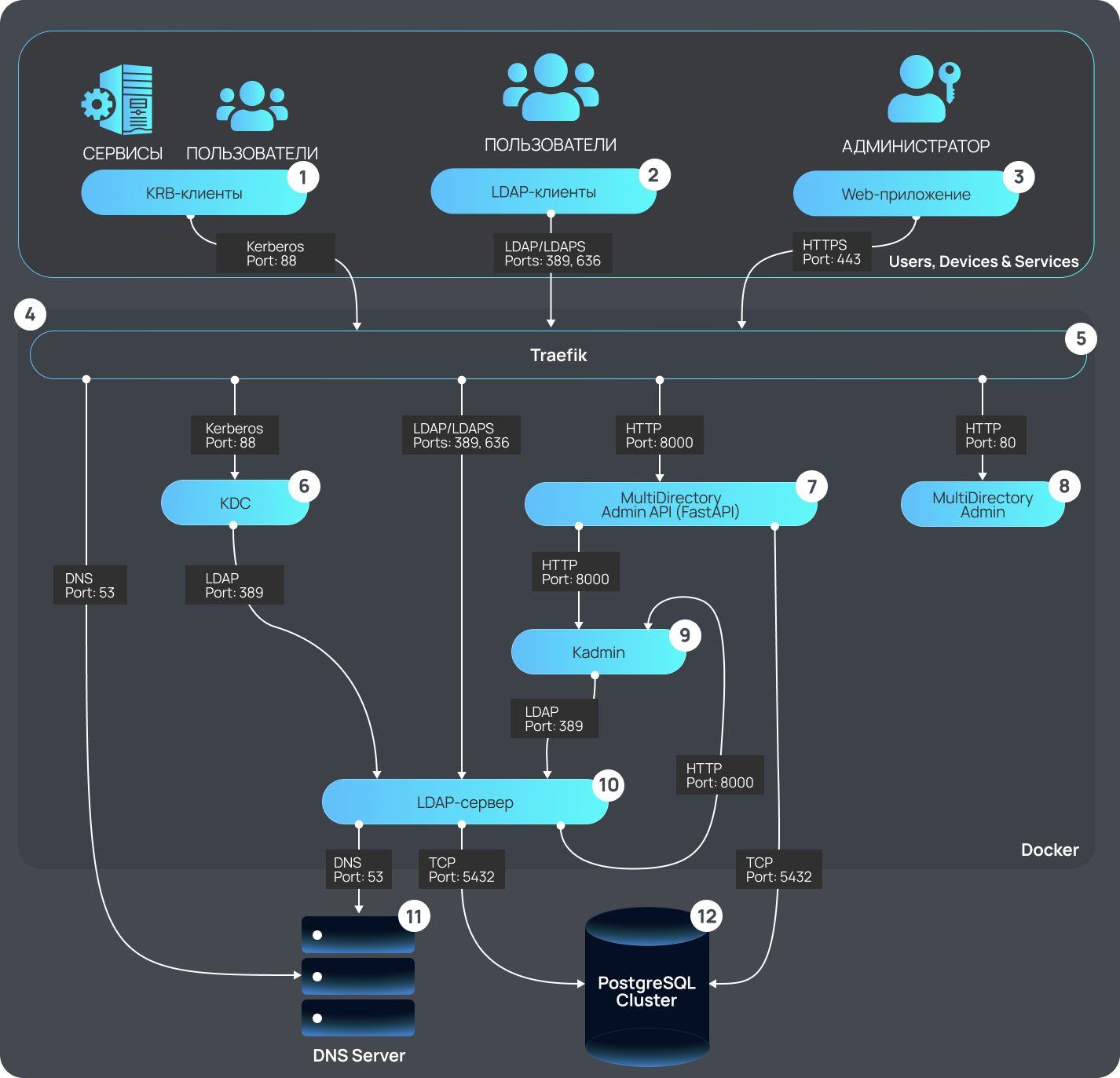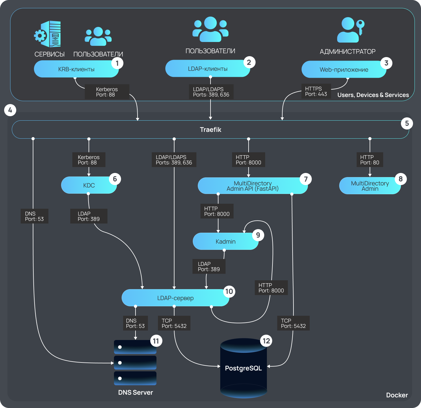 * LDAP — сервер представляет собой 4 сервиса в виде отдельных контейнеров, обеспечивая большую производительность и отказоустойчивость — на схеме представлен в виде одного блока.